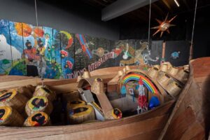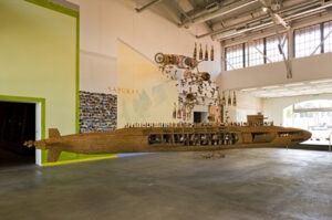 Yet this relational investment raises awkward questions. By “temporal luxury” I mean the ability to spend long periods on site because fees, travel and accommodation are covered by institutions based in Europe and the United States. In Rigo’s case, sustained accompaniment – months learning traditional construction methods with Guarani boat-builders and repeated stays with Zapatista communities over several years – relies on structural asymmetries of passport, income and mobility that his collaborators do not share. Teko Mbarate: Struggle for Life (2008) (Figures 1 and 2) makes this tension clear. Guarani, Quilombola and Caiçara artisans collectively transformed a replica missile submarine into a ceremonial structure, but the collaboration depended on his role in the “Human/Nature” exhibition, which funded four trips to Brazil between 2005 and 2008 and covered local production costs. This institutional support opened the time needed for him to learn traditional construction methods. According to Rigo, part of the project budget went directly to the artisans who trained him, at rates they themselves proposed. Cultural humility here is inseparable from the transnational funding streams that his projects often question.