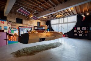 Another long term project, the Autonomous InterGalactic Space Program (PEAI), developed between 2009 and 2012 (Figures 4, 5, 6, and 7), emerged not from a pre-set artistic plan but from sustained dialogue with communities connected to the Zapatista movement in Chiapas, Mexico. The project’s conceptual anchor was a speculative question that inverted ethnographic inquiry’s colonial gaze: “If invited to a gathering on another galaxy, how would the Zapatistas get there”[17]The project’s origin story illustrates accompaniment rather than direction. After meeting with a Zapatista legal representative in Chiapas, Rigo asked for his speculative question to be passed on to a local painter, who remained anonymous under the name “Tomás.” In a gesture of reciprocal trust, Rigo left a monetary offering. The response he received established the project’s core iconography: three paintings from Tomás, one of which depicted a spaceship in the form of a giant corn cob – a potent symbol of Indigenous resistance – carrying Zapatista caracoles (snails, representing their autonomous municipalities).[18] This vision, authored by the anonymous painter, became the conceptual and visual foundation for the installation’s central sculpture, which Rigo later helped realize in San Cristóbal de las Casas, Chiapas, using traditional carpentry techniques in collaboration with local artisans. The spaceship was presented at EDELO, an art space in San Cristóbal, and later travelled to REDCAT in Los Angeles and other museum venues.[19]