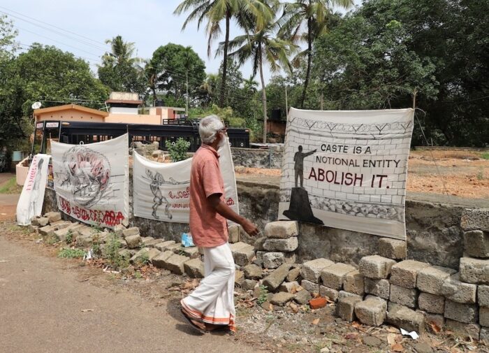 Despite the relative openness of the Keralite public sphere and the wishful imaginary it carries for the Indian art world with the formation of KMB, one must situate this development within the broader populist and authoritarian wave sweeping the subcontinent and steadily undermining liberal democratic institutions.[22] At a time when Kerala’s “left populism” dominates the mainstream with the electoral support of forward and other backward castes, it is often the outcaste communities, such as Dalits (formerly Untouchables) and Adivasis (tribal minorities), who provide a counterweight of critical conscience. Consider Vadayampady, a village just 25 kilometers from Kochi, which tested Kerala’s political conscience during 2017–18, when 180 Dalit families protested the construction of what they called a “caste wall.” This wall, still largely in place, blocked their access to public land after it was enclosed by a local Hindu temple committee led by members of the upper castes.