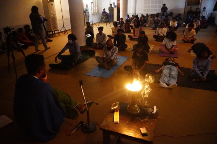 Despite the participation of young artists, and happening at the same time and in the same district as KMB’s most politically oriented yet populist edition—Possibilities for a Non-Alienated Life, curated by Dube—the Vadayampady movement and the police brutality against its protesters found no place in the biennale’s discourse.[23] However, a collective sense of “Dalit pride” emanating from the protest created ripple effects within the exhibition and beyond. This was exemplified by Keralite artist Vipin Dhanurdharanan’s “Sahodarar” (“‘Brotherhood”/“Sisterhood”), an open community kitchen inspired by the anti-caste practice of mishrabhojanam (inter-dining) introduced by social reformer Sahodaran Ayyappan (1889–1968).[24] While Dhanurdharanan’s work falls within the genre of community-based and dialogical art practice, Berlin-based artist Sajan Mani has expanded similar concerns into a more confrontational performance. In his ongoing project Political Yoga and one of its iterations in Kerala, Mani humorously exposes Hindutva’s global branding of the meditative exercise of Yoga as both a tool of soft power and a justification of its casteist (Brahminical) ideology.
