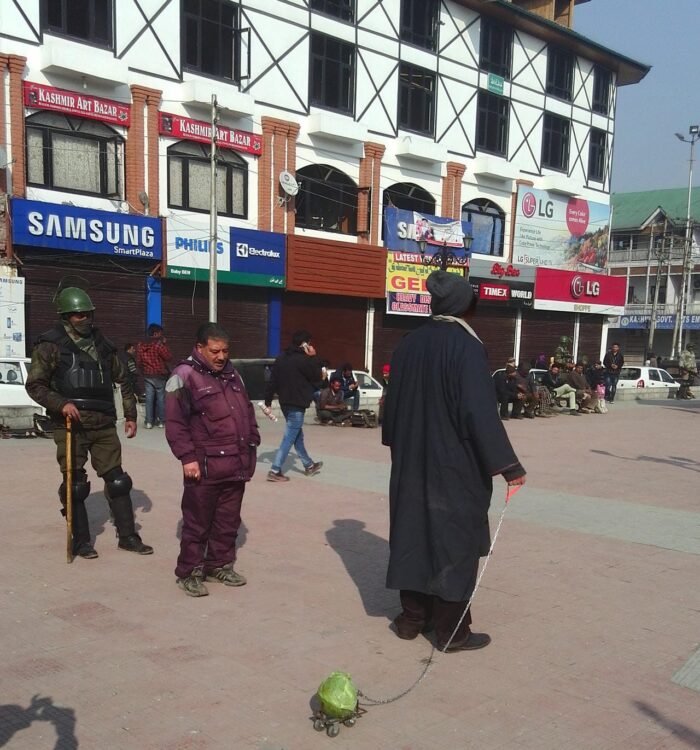 The Kashmir Valley, with its Muslim-majority population of 7.8 million—larger than that of many European countries such as Denmark or Norway—has for decades endured extreme military suppression and forced disappearances following the unresolved territorial conflict between India and Pakistan further intensified by indigenous armed insurgency. This situation has deteriorated further with India’s recent revocation of the region’s constitutionally guaranteed federal autonomy, motivated largely by settler-colonial and real estate interests.[26] At a time when civil associations and political mobilizations routinely provoke violent backlash and communication blackouts by the Indian state, known models of artistic intervention—whether dialogically participatory or militantly avant-garde—have become largely unsustainable or inoperative. Historically deprived of the means of political and cultural representation, and thus confronted with the problem of the unrepresentable, many contemporary Kashmiri artists appear to embrace an aesthetic of the real which is often articulated through the visceral and the indexical, with an approach oscillating between performative madness and clinical detachment, absurdist humor rooted in the local folk tradition of Band Pather and melancholic lyricism as seen in the poems of Agha Shahid Ali (1949–2001). As a result, on the one hand, we find artists using their own bodies as a medium—with examples ranging from the performance artists Nasir Hassan and Khursheed Ali to Kashmiri Cabbage Walker (a mysterious public figure modeled after the eponymic character performed by Chinese artist Han Bing).[27]
