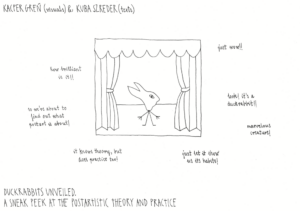 Over the last years, some of our colleagues engaged in organizing a string of ecologically minded projects in Opolno Zdrój, a small village on the verge of the largest open-pit mine in Poland, using postartistic sensibilities to tickle the underbelly of extractive economy. Others curated postartistic exhibitions, biennales, or congresses. Some engaged in enacting commons-based programming in artistic institutions, where mixed results were always underpinned by genuine dedication. Some unionized. Some went on strike. Some moved on. Some fought against perennial antisemitism, doing legwork in former shtetles. Some mobilized and organized demonstrations in solidarity with Palestine. Sometimes it was rather tense, with comradeship being tested and resolve challenged, but hopefully those discussions did not devolve into unbridgeable rifts. Duckrabbits, while enjoying a brief period of silence in between the storms, replenished their energies, so very much needed going forward. It is telling that only some searched for greener pastures; most stayed where they were. In Poland, that is to say everywhere.